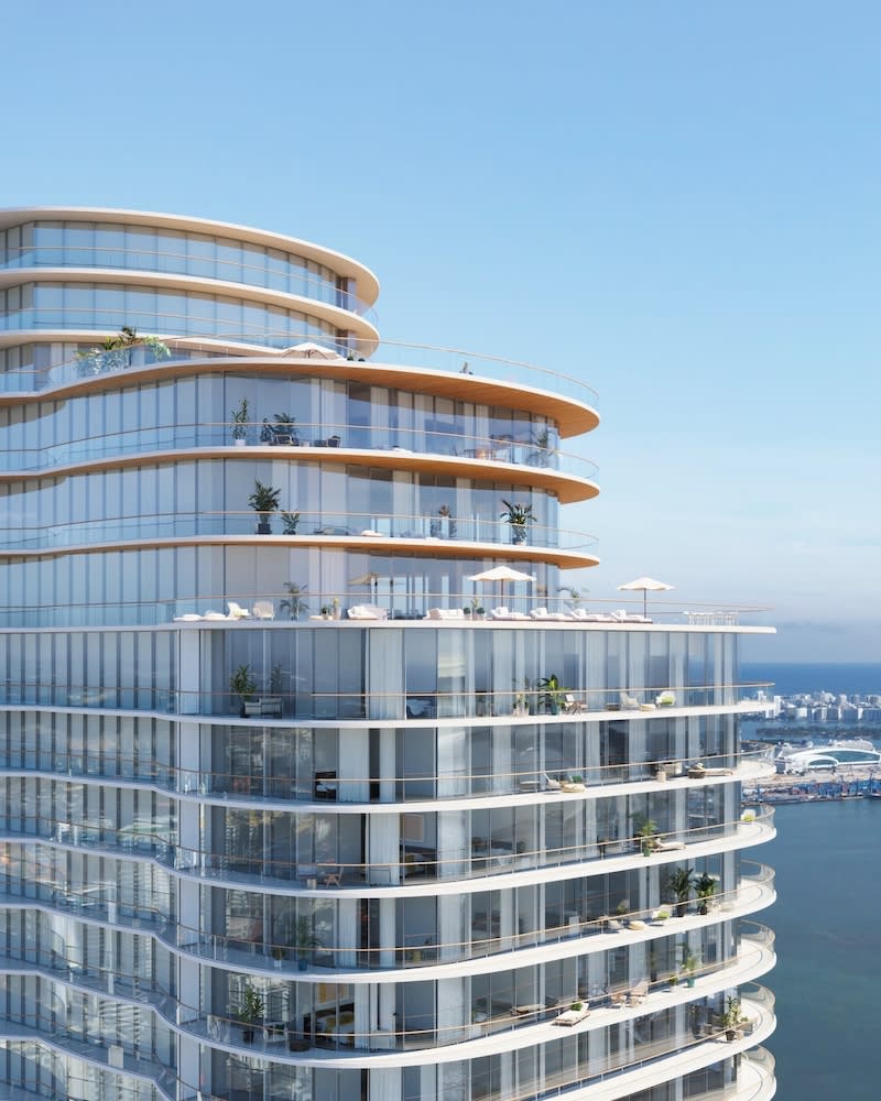 Masterfully crafted by a renowned design team, the distinctive glass tower features an organic, curved façade and nautical details reminiscent of the Italian Riviera.